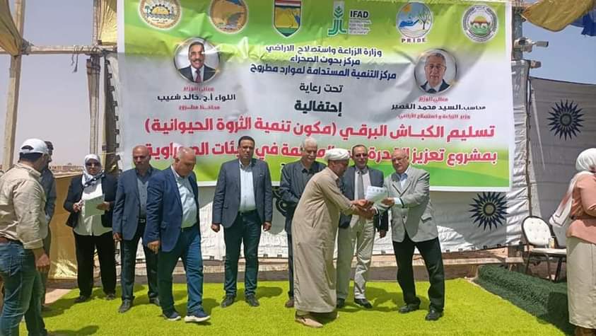 نظم مركز التنمية المستدامة التابع لمركز بحوث الصحراء ومشروع تعزيز القدرة على الموائمة في البيئات الصحراوية "برايد " صباح اليوم احتفالية توزيع الكباش البرقي بمطروح وذلك لتحسين والحفاظ على سلالة الاغنام البرقي المحسنة بحضور العميد حاتم السبع السكرتير العام المساعد لمحافظة مطروح والمهندس احمد يوسف مدير مديرية الزراعة والعمدة خير رسلان رئيس مجلس العمد والمشايخ بمطروح ومربي الثروة الحيوانية بالمحافظة