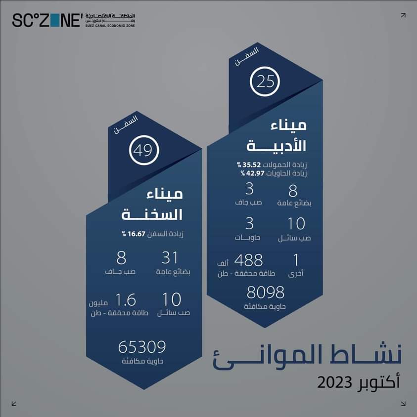 وذكر البيان أن ميناء السخنة قد استقبل 49 سفينة خلال أكتوبر بحمولات إجمالية 1,565,164.81 طن، منها 31 سفينة بضائع عامة محواة بحمولة 698215 طن، و8 سفن صب جاف بحمولة 333289.51 طن، و10 صب سائل بحمولة 533660.3 طن، وكانت أعداد الحاويات 65309 حاوية مكافئة، وبلغت الزيادة في معدل السفن 16.67% مقارنة بأكتوبر عام 2022 حيث استقبل الميناء حينها 42 سفينة.