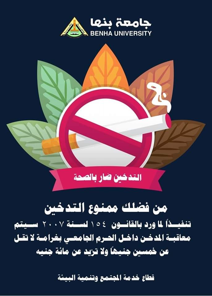 أعلن الدكتور السيد فوده نائب رئيس جامعة بنها لشئون خدمة المجتمع وتنمية البيئة عن انطلاق حملة توعية وحظر التدخين واستخدام التبغ في الحرم الجامعي وداخل ادارة الجامعة ،وذلك بناءً على توجيهات الدكتور ناصر الجيزاوى رئيس الجامعة.