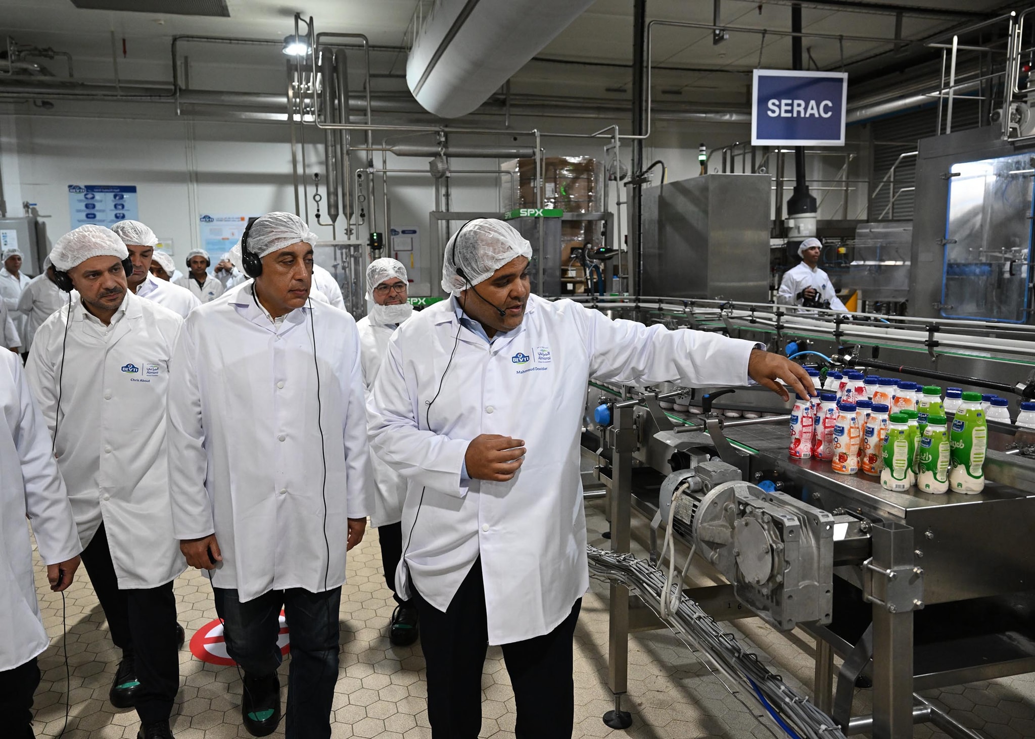 وعقب ذلك، توجه الدكتور مصطفى مدبولي ومرافقوه للتعرف على مكونات المصنع، ومراحل الإنتاج المختلفة به، وفي غضون ذلك أشار المهندس محمود دويدار، مدير عام العمليات والمصانع بالشركة، إلى أن المصنع يقع على مساحة 120 فدانا، منها 20% مساحة بنائية، وهناك 28 خط إنتاج تلبي أعلى المعايير العالمية، موضحا أن المصنع ينتج أكثر من 100 منتج متاح في الأسواق المحلية والدولية، ويبلغ الإنتاج السنوي 535 مليون لتر، بما في ذلك 220 مليون لتر من الحليب، و230 مليون لتر من العصائر، بالإضافة إلى 85 مليون كيلو جرام من الزبادي، كما تسعى الشركة لإنتاج 100 ألف طن من الجُبن سنويًا، مستعرضا إنجازات الشركة منذ تأسيسها في 1998 وحتى 2025، حيث حصلت الشركة على جائزة "أثر للاستدامة"؛ تقديراً لريادتها في الاستدامة والمسئولية الاجتماعية.