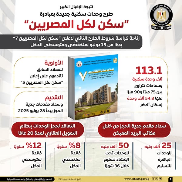 وأشارت الإنفوجرافات إلى أنه تم إتاحة كراسة شروط الطرح الثاني لإعلان "سكن لكل المصريين 7" بدءًا من 15 يوليو الجاري لمنخفضي ومتوسطي الدخل، حيث يشمل الطرح نحو 113.1 ألف وحدة سكنية، بمساحات تتراوح بين 75 مترًا و90 مترًا، منها 54.8 ألف وحدة إسكان أخضر، مع منح الأولوية للعملاء السابق تقدمهم على إعلان "سكن لكل المصريين 5".