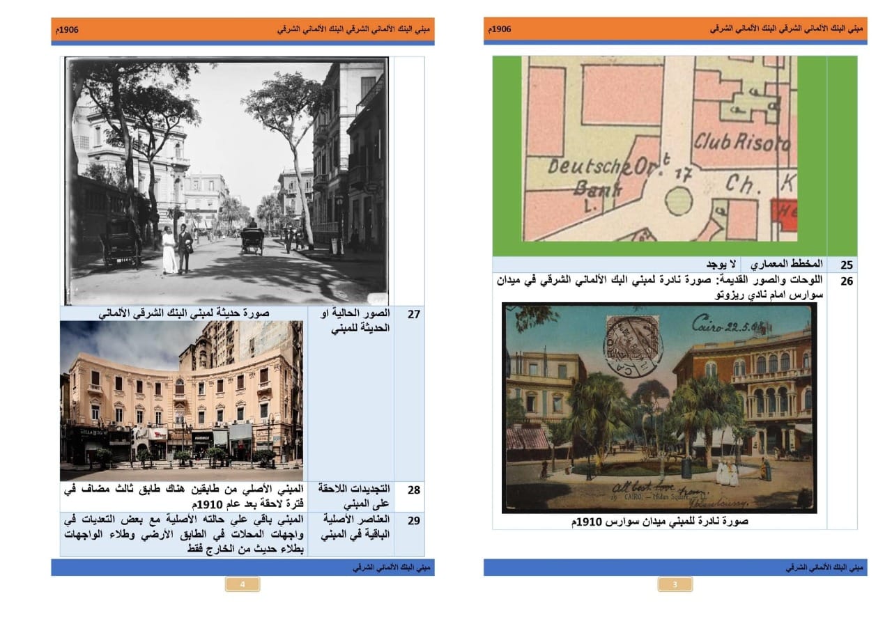 حيث قامت اللجنة بإعداد دراسة تاريخية للمباني التراثية على مستوى القاهرة لحوالي ٤٠٠ مبنى تراثي ذات الطابع المعماري المتميز داخل المناطق ذات القيمة بالقاهرة، وهي "القاهرة الخديوية ، التاريخية، مصر الجديدة"، حيث يتم جمع كافة البيانات الخاصة بالمبنى من حيث "اسم المبنى، الحقبة التاريخية، وظيفة المبنى، موقعه القديم من خلال الصور، موقعه حاليًا، اسم المعماري الذي قام بإنشاء المبنى، الوصف والتخطيط العام للمبنى"، وكذلك ضم كل تفاصيل المبنى وعناصره المعمارية، مُضيفًا، أن الجهاز يقوم أيضًا بالتوثيق الدقيق للتفاصيل المعمارية لواجهات المباني ذات الطابع من خلال تكنولوجيا الرفع المساحي ثلاثي الأبعاد ، ويأتي ذلك في إطار دور الجهاز في إعداد الأرشيف القومي للمباني التراثية ذات الطابع المعماري المتميز بجميع محافظات الجمهورية